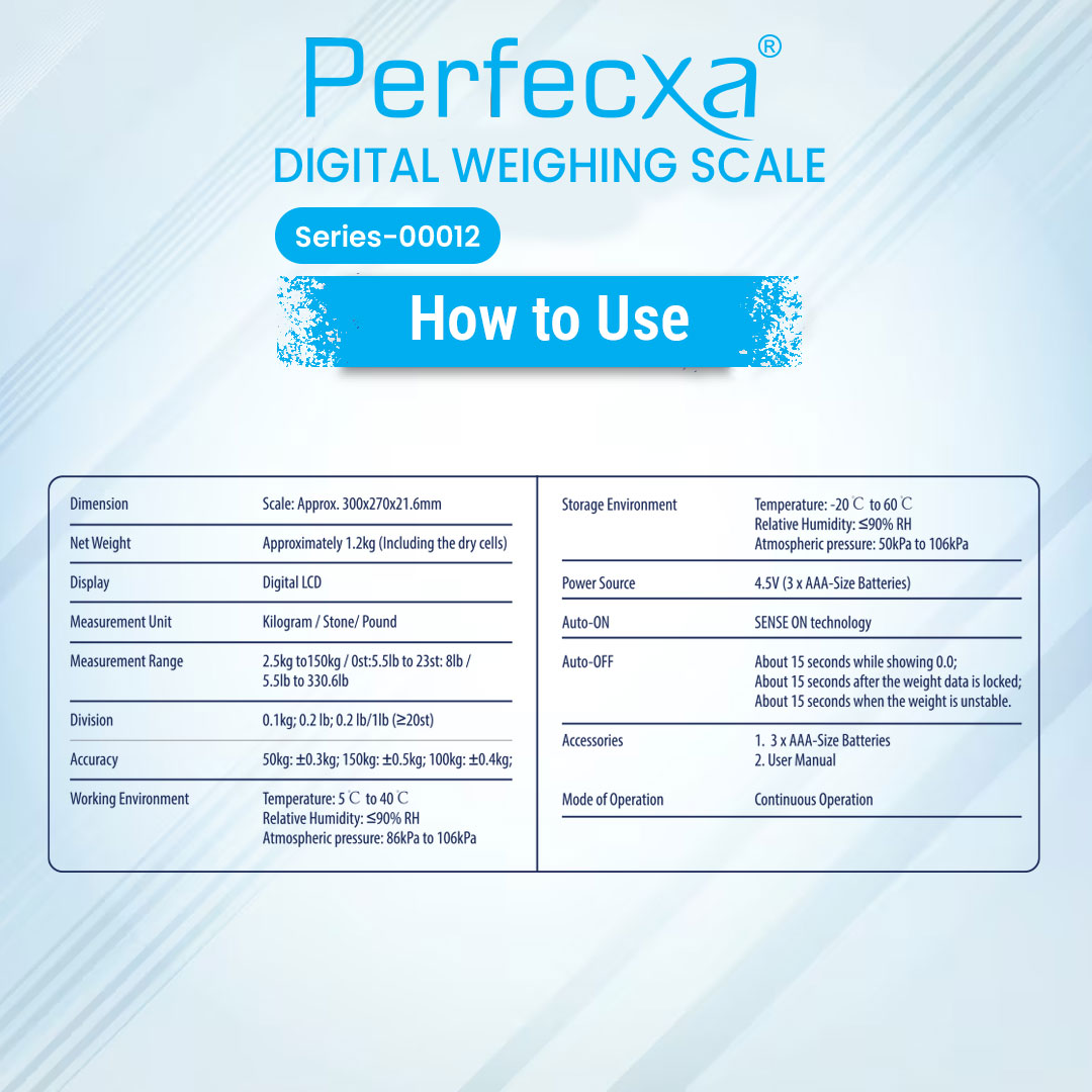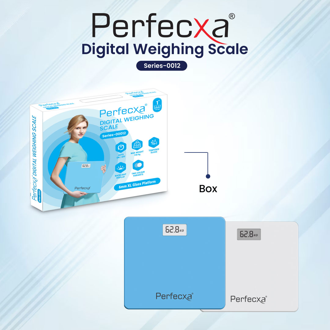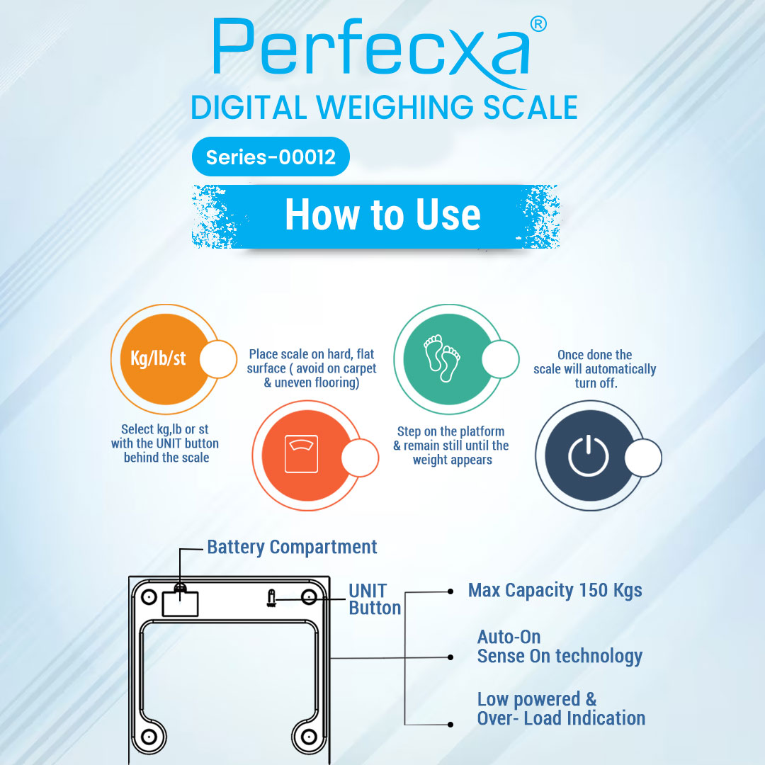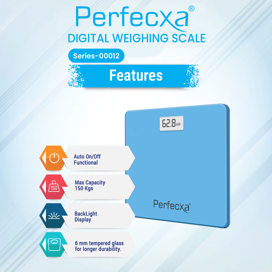 The Perfecxa Digital Weighing Scale offers precise weight measurements with a maximum capacity of 150 kg. It features an extra-large platform for better balance and ease of use, along with an auto on/off function and backlight display for easy reading. Constructed with durable 6 mm tempered glass, it ensures long-lasting use. The scale also provides unit selection (kg/lb/st) and is equipped with low power and overload indicators for added convenience. Designed with Auto-On Sense technology, it activates when you step on it, making it effortless to use.