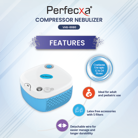 The Perfecxa Compressor Nebulizer is designed for both adult and pediatric use, providing efficient and effective respiratory therapy. It includes latex-free accessories and 5 filters for safe, hygienic use. The detachable power cord enhances durability and ease of handling, making it an ideal solution for consistent, long-term respiratory care.